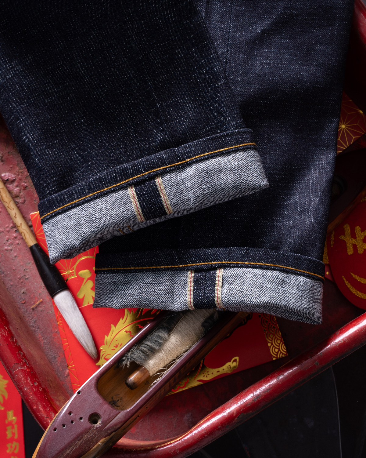 The Elephant 13 – Red Core is a Japanese selvedge that fades from deep indigo to reveal a bold red core, offering a heavyweight denim with a striking twist.