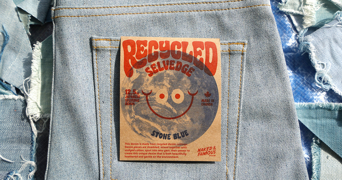 Eco-friendly raw Japanese selvedge denim. The Recycled Selvedge - Stone Blue starts with the left-over denim material from the fabric cutting stage in production, these scraps are typically unused wastage. Instead of being discarded they are, shredded up, combined with undyed cotton, then spun into new yarn. These yarns are then woven together on vintage Japanese shuttle looms into to create the Recycled Selvedge – Stone Blue. The unique blue color is reminiscent of stone-washed jeans but comes from the recycled denim showing its past in the form of subtle variations of blues throughout the fabric. The pink selvedge ID match up against the pastel blue tone of the denim. Maintaining sustainability throughout, the leather patch is made from recycled leather scraps fused together. The denim is a classic-weight 12.5oz ideal for year-round wear.