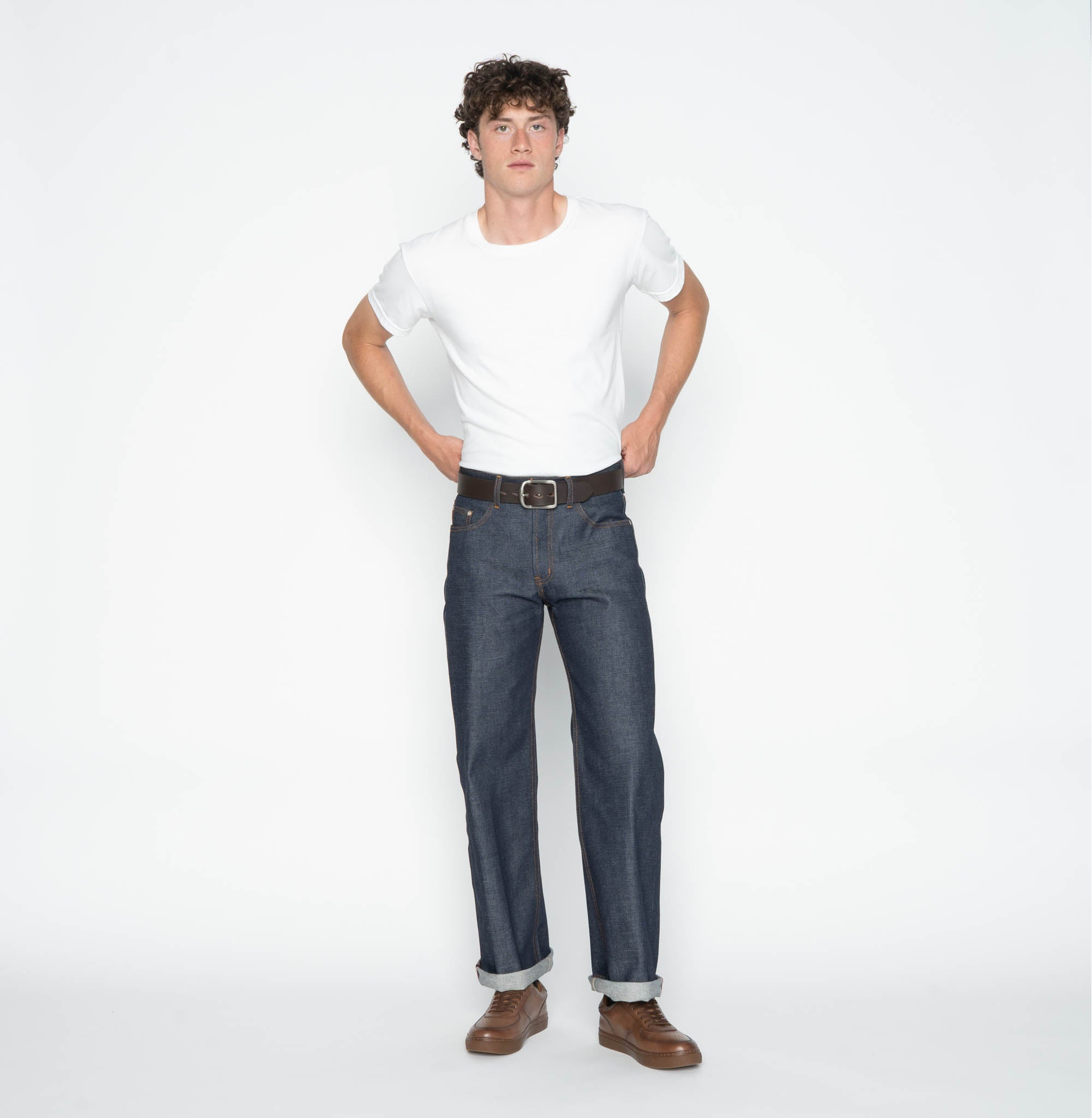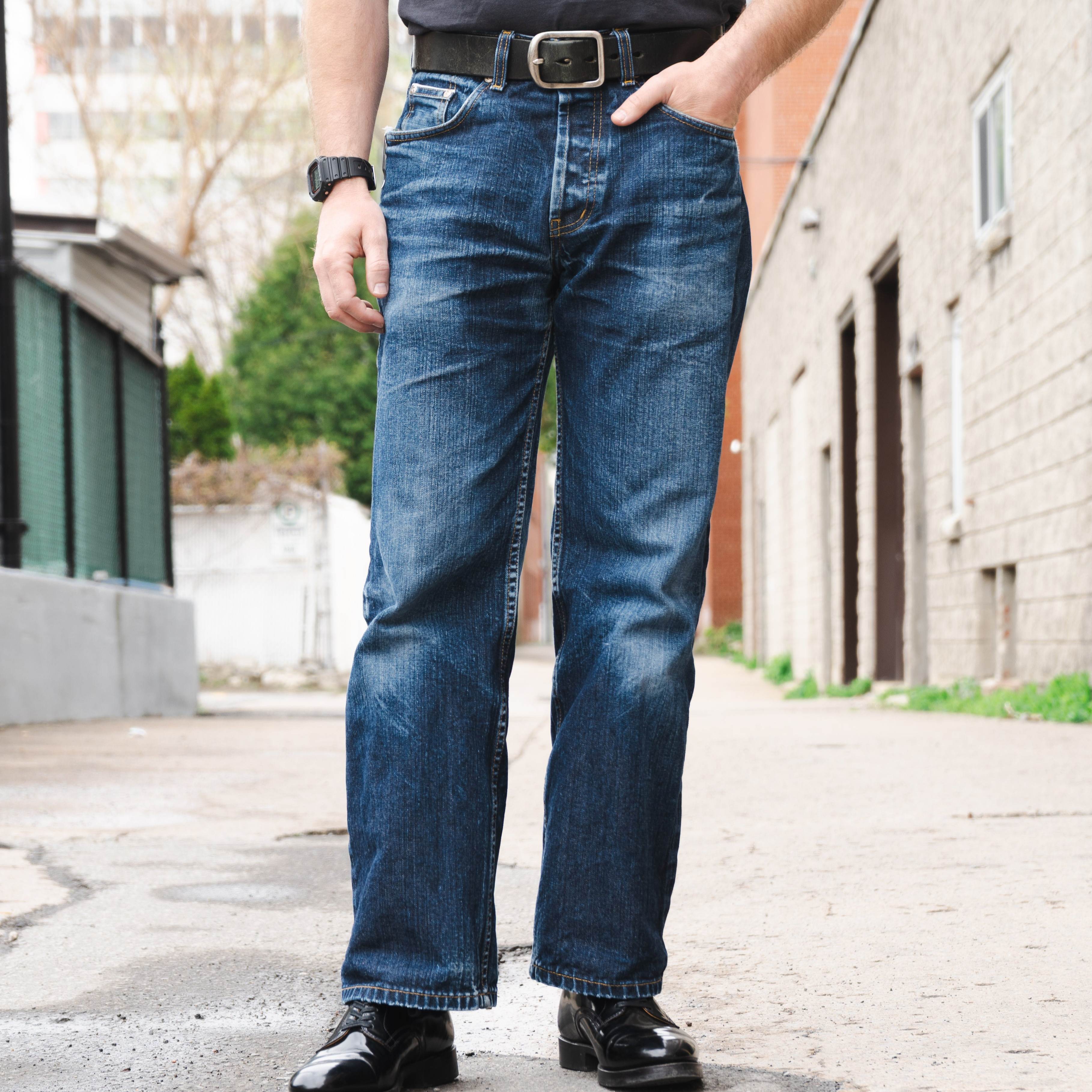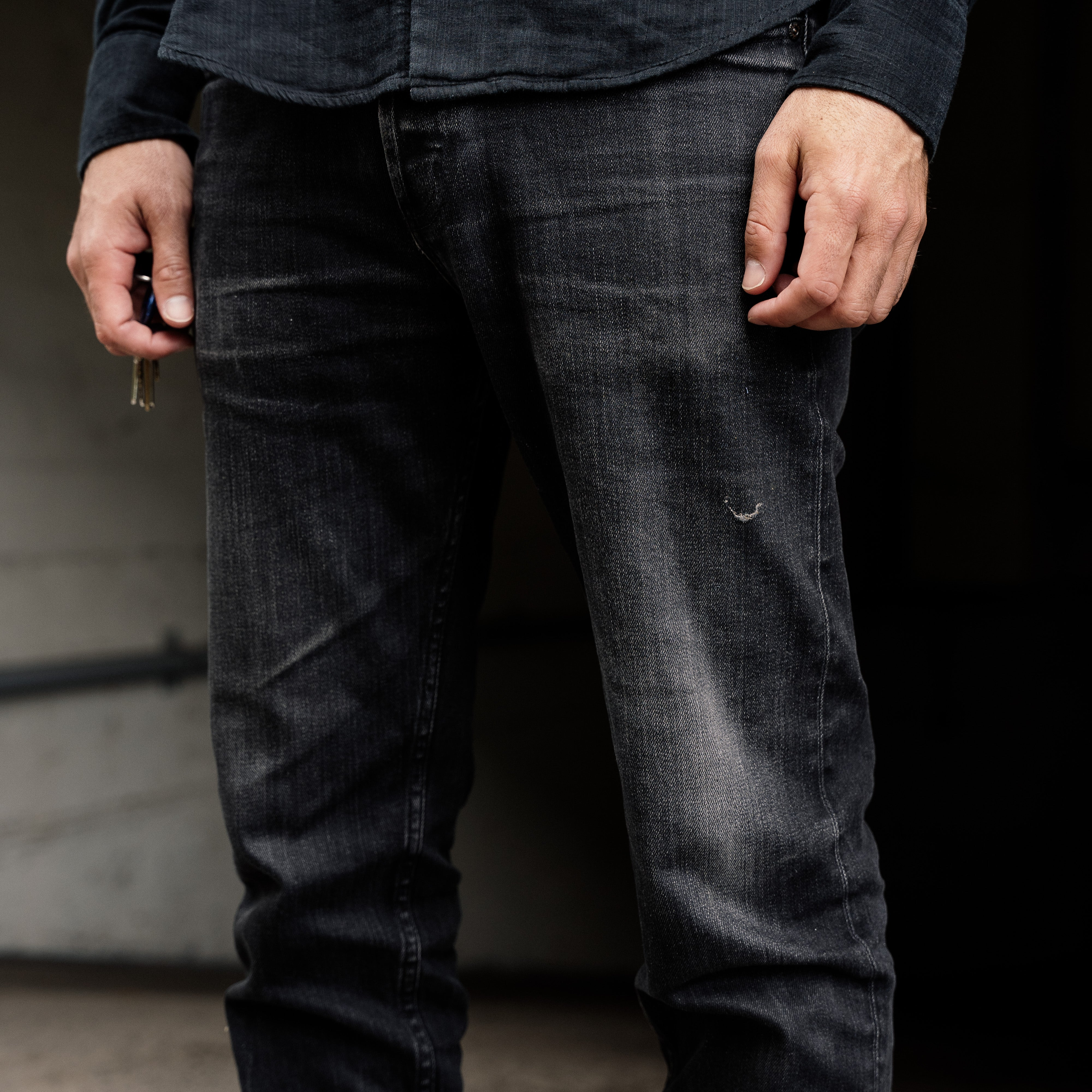 À gauche, un jean Weird Guy tout neuf en indigo naturel Selvedge ; à droite, le même après des mois d'usure. Ces décolorations ne sont pas préfabriquées en usine, elles sont le résultat du quotidien. Chaque jean développe ses propres "fades"; moustaches, nids d'abeilles et nuances, devenant ainsi le reflet de son propriétaire.