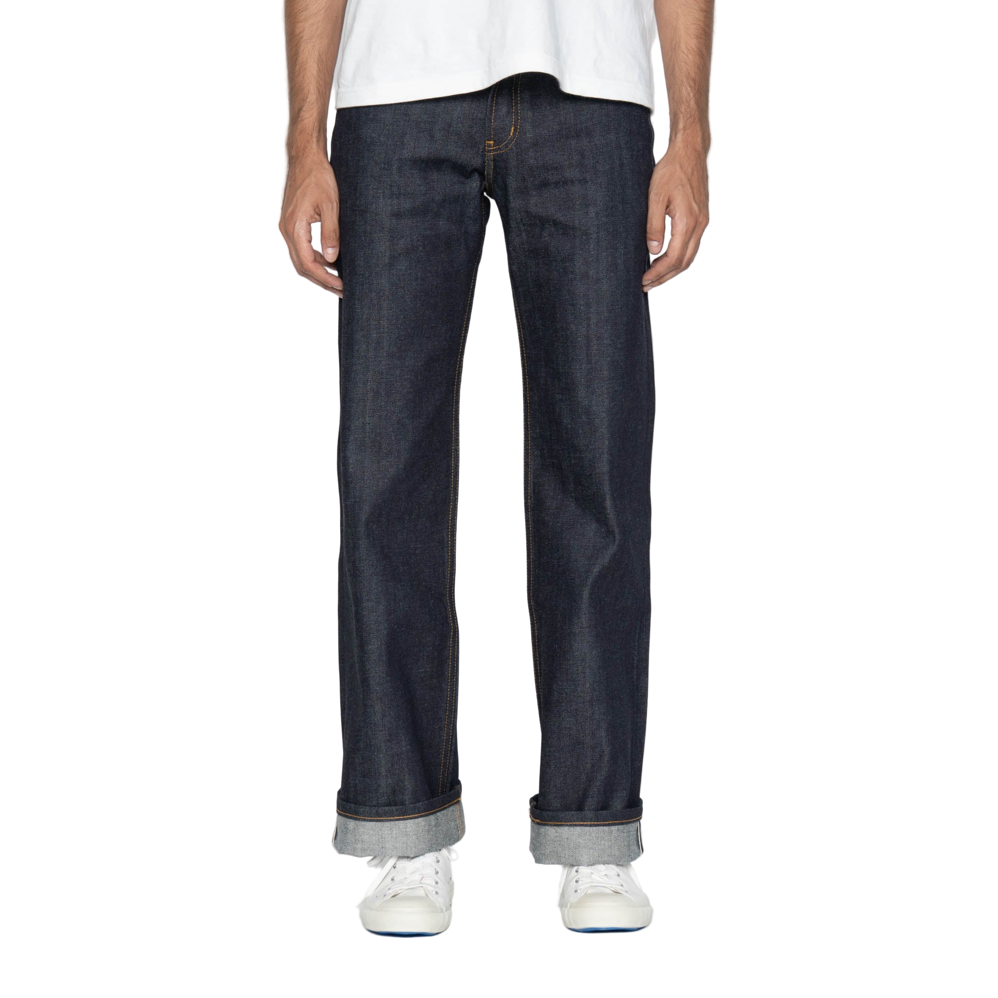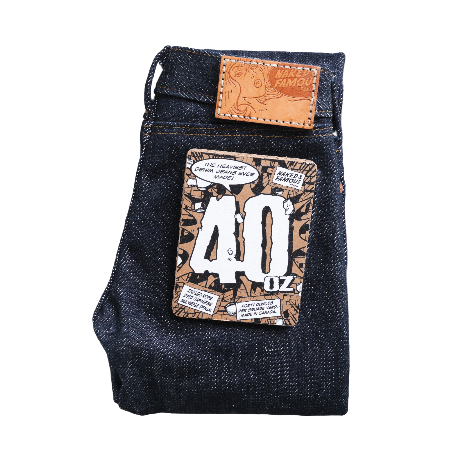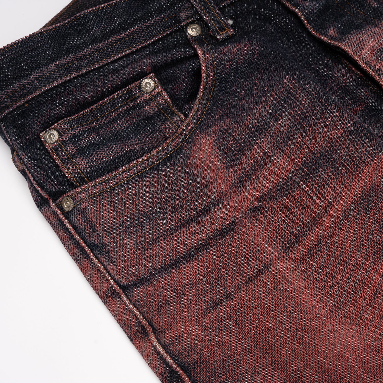 À gauche, un jean Weird Guy tout neuf en indigo naturel Selvedge ; à droite, le même après des mois d'usure. Ces décolorations ne sont pas préfabriquées en usine, elles sont le résultat du quotidien. Chaque jean développe ses propres "fades"; moustaches, nids d'abeilles et nuances, devenant ainsi le reflet de son propriétaire.