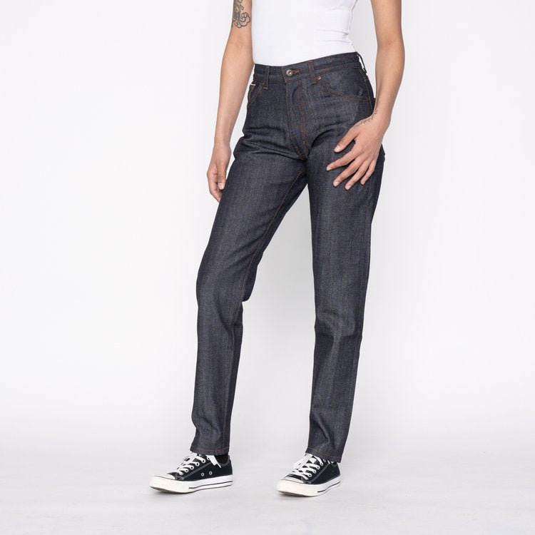Our take on mom jeans. High rise, fitted around hips with slim tapered legs.