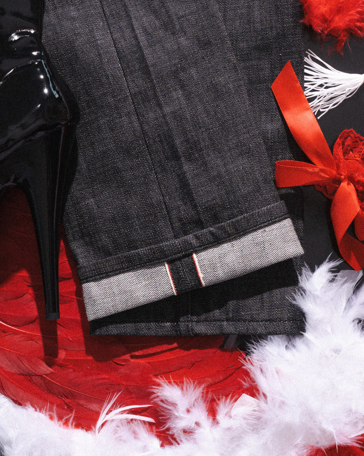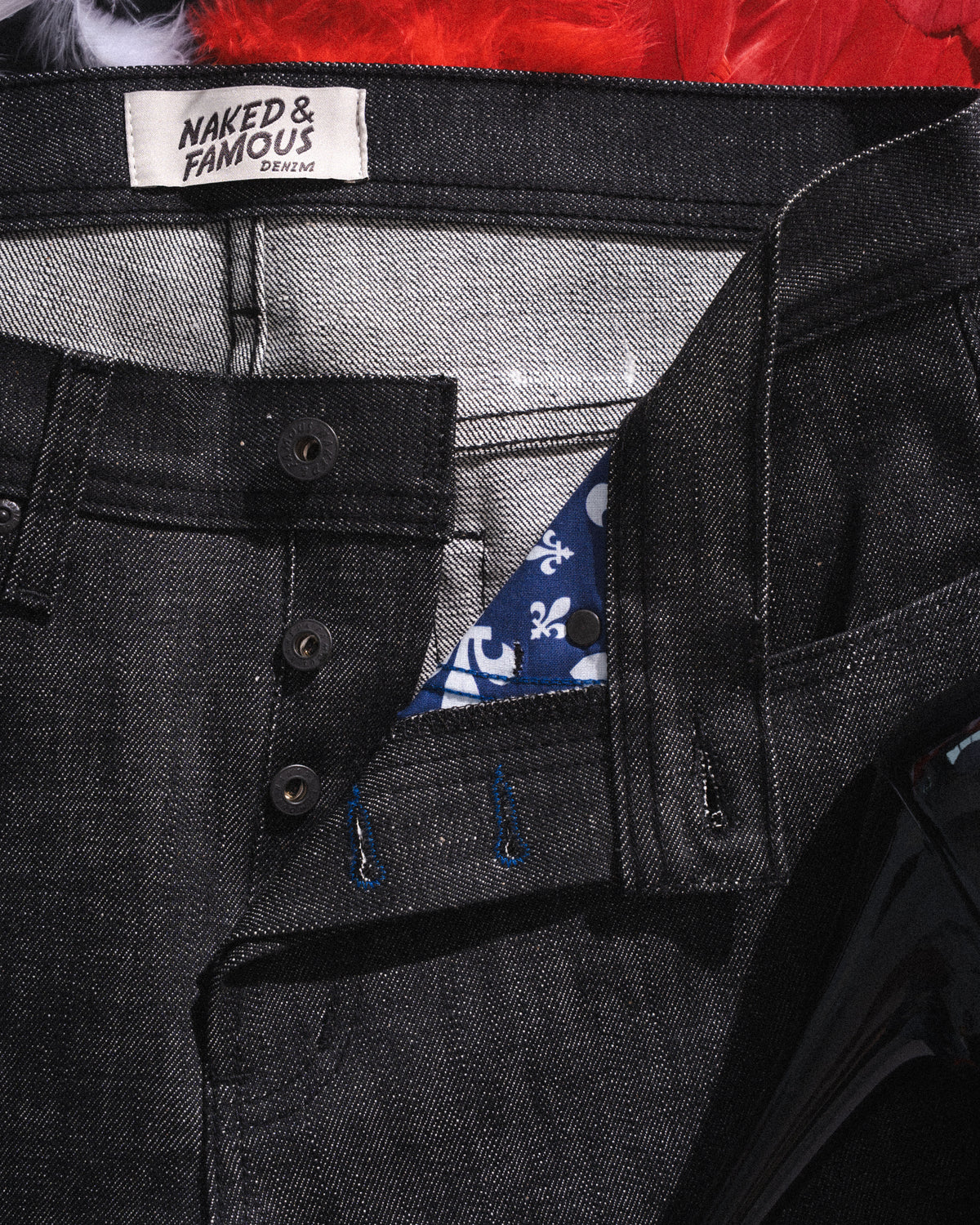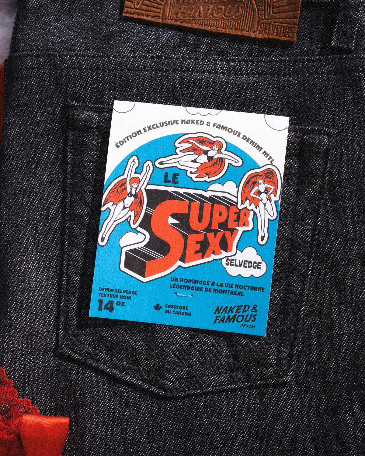 The selvedge detailing in red and white is a nod to the neon glow and vibrant hues that light up Montreal’s nightlife, adding a signature edge that’s immediately striking. Inside, fleur de lys pocket bags celebrate Quebec’s emblematic symbol, a subtle homage to heritage and pride woven right into the garment.