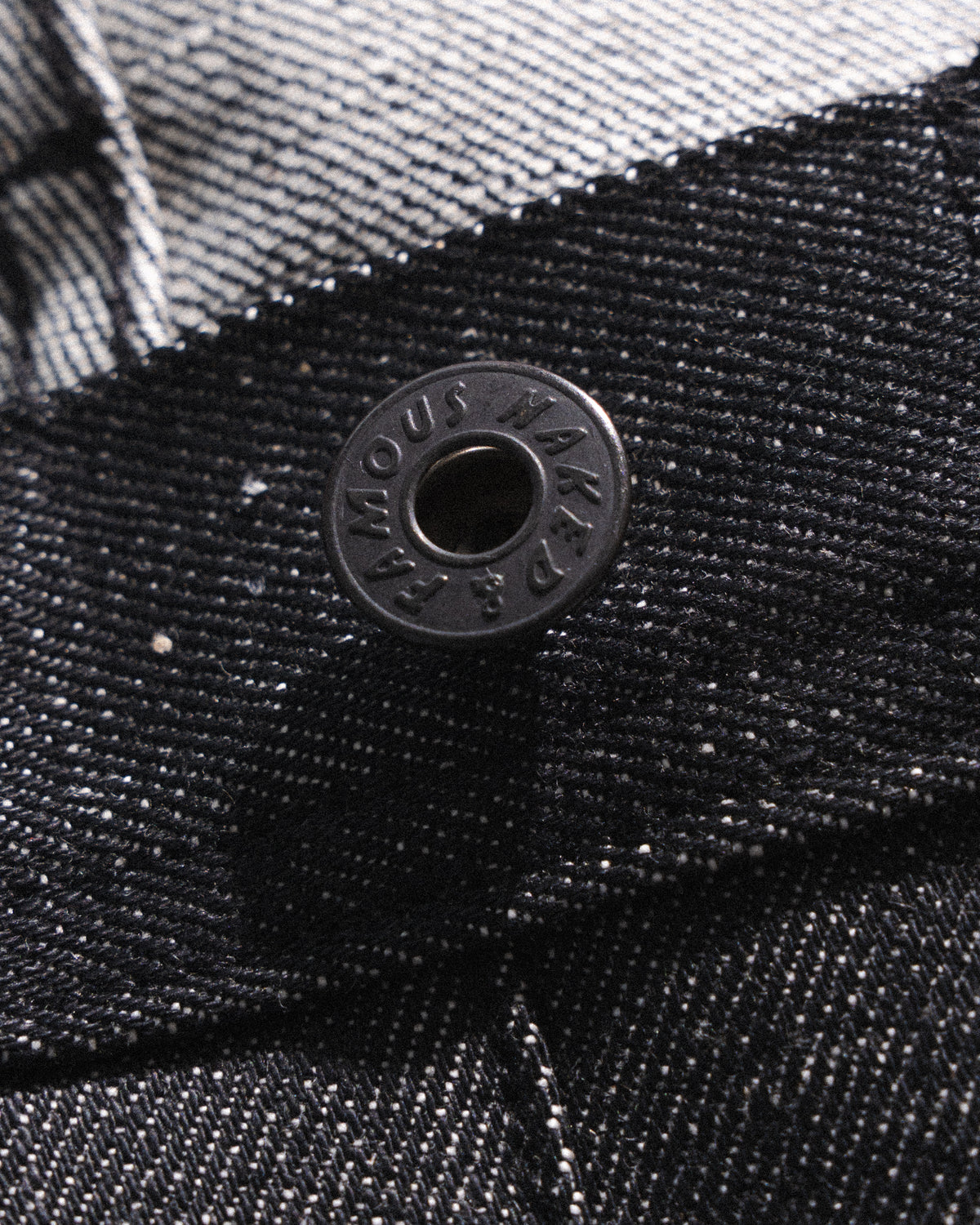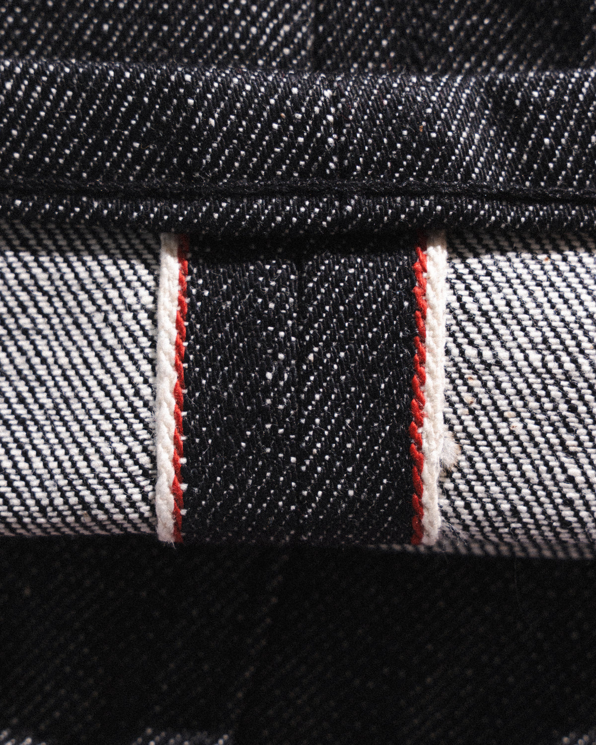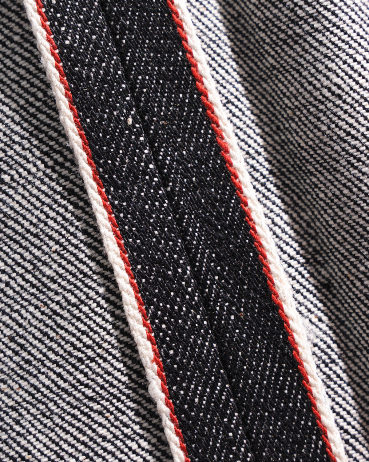 The selvedge detailing in red and white is a nod to the neon glow and vibrant hues that light up Montreal’s nightlife, adding a signature edge that’s immediately striking. Inside, fleur de lys pocket bags celebrate Quebec’s emblematic symbol, a subtle homage to heritage and pride woven right into the garment.